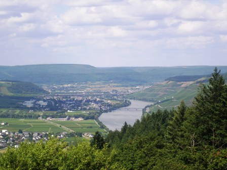 The Mosel valley and its vineyards near Schweich with the “wine villages” of Riol (left) and Longuich, photo taken from the freeway opposite Mehring in August 2008