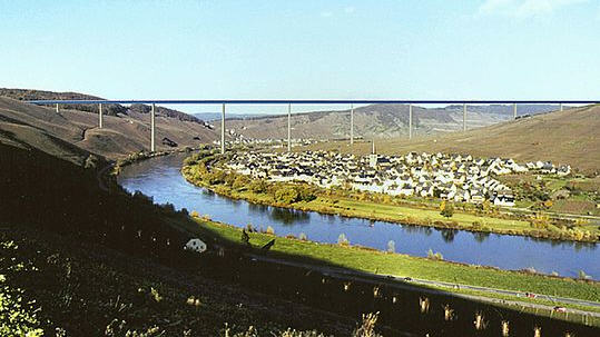 The planned bridge is massive. It is about 160 meters high and 1.7 km long. It will probably cost about 270 million EURO which is equivalent to about US $ 400 million. On the facebook site above you can find more photos and animations showing you what the bridge will do to the Mosel valley.