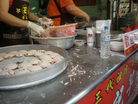 It seems Yu Tou Guo (芋 頭 粿) is made from taro, a tropical root vegetable. It is a kind of steamed taro cake, stuffed with some filling. I saw the women doing it, but did not ask because this stall was very busy. I will have to find out what the filling is made of. I did not dare buying one since it looked raw and not ready for consumption. All the buyers took it away, nobody ate from it on the spot. I will have to find out more and give it a try next time.