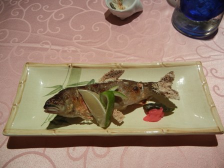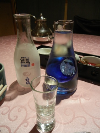 We ordered Sake. Jim preferred the cold one which came in a carafe with a whole in it in which ice cubes were placed to keep the Sake cold. Fancy stuff. I choose the warm Sake which was a delightful drink.