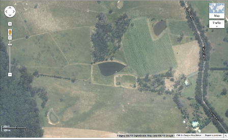 The road on the right, is Two Hills road and the gum trees lining it. On the left side from the road one can see our two dams, the two vineyards (between the dams and right from the dam on the right). Also the shed can be identified. The white “lines” around the different blocks are from my slashing with the tractor. Also my windbreak can be seen (left line leading to the creek).