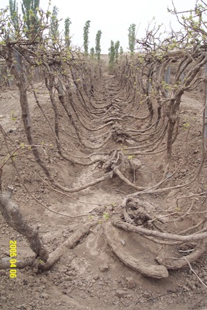 The vines are irrigated with an age old irrigations system, called the Karez system. The water from the surrounding mountains, mostly from melting snow, is brought to Turfan through a sophisticated system of wells and deep channels dug by hand and lined with sheep skins. Thousands of kilometres of underground water channels can be found. From this precious resource mostly vegetables and fruit are grown.