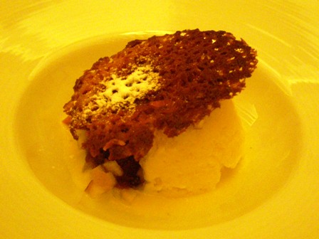 The next dish was a mussel decorated “fine cuisine style”, followed by a white fish with lemon on a bed of vegetables. I even did not say no to the dessert, vanilla ice cream with a crusty waffle cover.