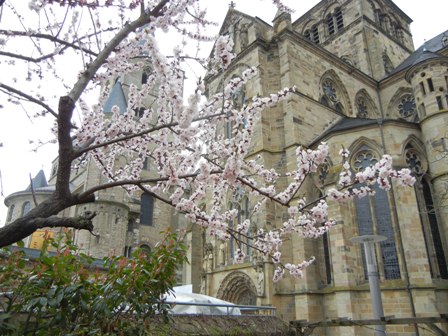 When I left the Kesselstatt wine bar revitalized and in high spirits, I walked out to a cherry tree in full blossom with a splendid view of the adjacent church of St. Liebfrauen and the cathedral (Dom, left).