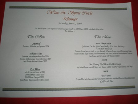 The Domaines Schlumberger Gewuerztraminer was semi-dry I would say but showed some very fine aromas and great balance. Also the Pinot Gris must have had some high residual sugar because I perceived it as almost sweet. Both wines went well with the Asian food. However, I liked the Sylvaner best. Unfortunately, I did not check the bottles to identify from which “terroir” the Schlumberger wines came from (there are 4 grand crus: Kitterle, Kessler, Saering and Spiegel) and the wine list is silent about their provenience. Maybe we drank only the “normal” wines (Les Princes Abbes) and not the ‘grand crus’.